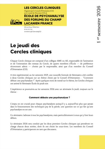 Cercle 1 : Devenir analysant Avec : Le jeudi des Cercles cliniques Chaque Cercle clinique est composé d’un collègue AME ou AE, responsable de l’animation et de l’orientation des travaux du Cercle, de quatre membres d’École — de préférence récemment admis — choisis par le responsable, ainsi que d’un membre du Conseil d’Orientation (CO). À […]