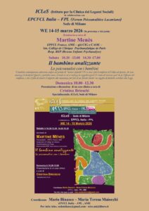 Martine Menès est invitée pour un week-end de travail, elle donnera une conférence ayant pour titre : « Il bambino analizzante. La psicoanalisi con i bambini ».