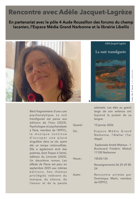 Rencontre avec Adèle Jacquet-Lagrèze autour de son livre, La nuit transfigurée, éditions de l’insu, le samedi 10 janvier à 10h30 à la médiathèque de Narbonne. Elle sera accompagnée de son violoncelle.