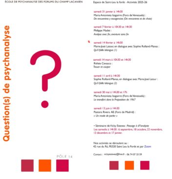 Il n’y a pas de rapport sexuel qui puisse s’écrire, mais il y a l’amour Conférence d’Emmanuelle Pajot, psychanalyste à Paris, membre de l’EPFCL Samedi 14 mars 2026 de 14h à 16h Lieu : Cercle Colbert, à Reims Et en visio conférence : https://us02web.zoom.us/j/87800038973?pwd=rbDydWb9WeLsTEdqSQ4LHnLazAxark.1 ID de réunion: 878 0003 8973 – Code secret: 505249 Renseignements […]