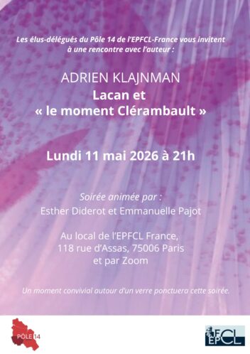 Chers collègues, Pour la troisième rencontre de l’année de Place Analytique, nous vous donnons rendez-vous le lundi 13 avril à 21 h, à la Maison fraternelle, 37 rue Tournefort – Paris 5. Notre cycle de discussions De la situation des concepts à la situation analytique se poursuit autour du thème de l’année : L’objet cause […]