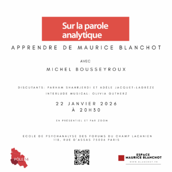 Apprendre de Maurice Blanchot Avec Michel Bousseyroux Discutants: Parham Shahrjerdi et Adèle Jacquet-Lagrèze Interlude musical: Olivia Gutherz 22 janvier 2026 à 20h30