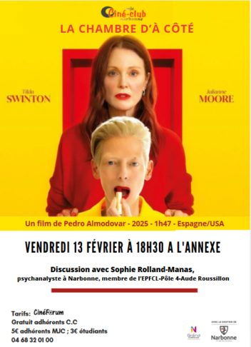 En partenariat avec le ciné-club de la MJC de Narbonne aura lieu le 13 février à 18h30 à l’annexe de la MJC, 4 rue Deymes, la projection du film, « La chambre d’à côté » de Pedro Almodovar. Suivra une discussion avec Martine Lassalle, directrice du ciné-Club et Sophie Rolland-Manas