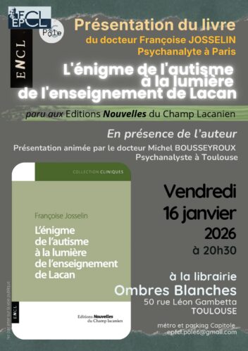 TOULOUSE – OMBRES BLANCHES – 16/01/2026 à 20H30 Michel Bousseyroux, psychanalyste à Toulouse, présentera le livre de Françoise Josselin, psychanalyste à Paris, en sa présence : « L’énigme de l’autisme à la lumière de l’enseignement de Lacan » Éditions nouvelles du champ Lacanien