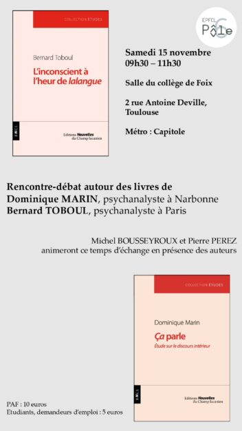 Michel Bousseyroux et Pierre Perez animeront ce temps d’échange en présence des auteurs. Communauté Municipale de Santé, 2 rue Malbec, 31 000 Toulouse. Paf : 10 euros – Contact et renseignements : epfcl.pole6@gmail.com