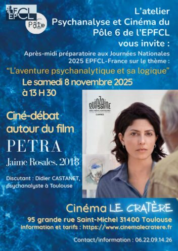 Ciné-débat autour du film PETRA, de Jaime Rosales, 2018 L’atelier Psychanalyse et Cinéma du pôle 6 de l’EPFCL vous invite à une après-midi préparatoire aux Journées Nationales 2025, sur le thème : « l’aventure psychanalytique et sa logique ». Discutant : Didier Castanet, psychanalyste à Toulouse. Cinéma Le Cratère, 95 Grande rue Saint Michel 31400 […]