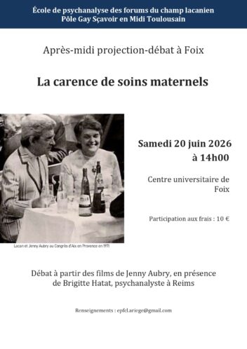FOIX – Samedi 20 juin 2026 à 14h Projection-débat : La carence des soins maternels Débat à partir des films de Jenny Aubry, en présence de Brigitte Hatat Psychanalyste à Reims Centre universitaire de Foix PAF : 10 euros. Renseignements : epfcl.ariege@gmail.com