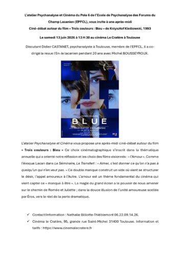 Ciné-débat autour du film « Trois couleurs : bleu » de Krzysztof Kiéslowski, 1993 Organisé par l’atelier Psychanalyse et Cinéma du pôle 6 de l’EPFCL Discutant : Didier Castanet, psychanalyste à Toulouse. Cinéma Le Cratère, 95 Grande rue Saint Michel 31400 Toulouse Informations et tarifs : https://www.cinemalecratere.fr Contact et renseignements : Nathalie Billiotte-Thiéblemont : 06 […]
